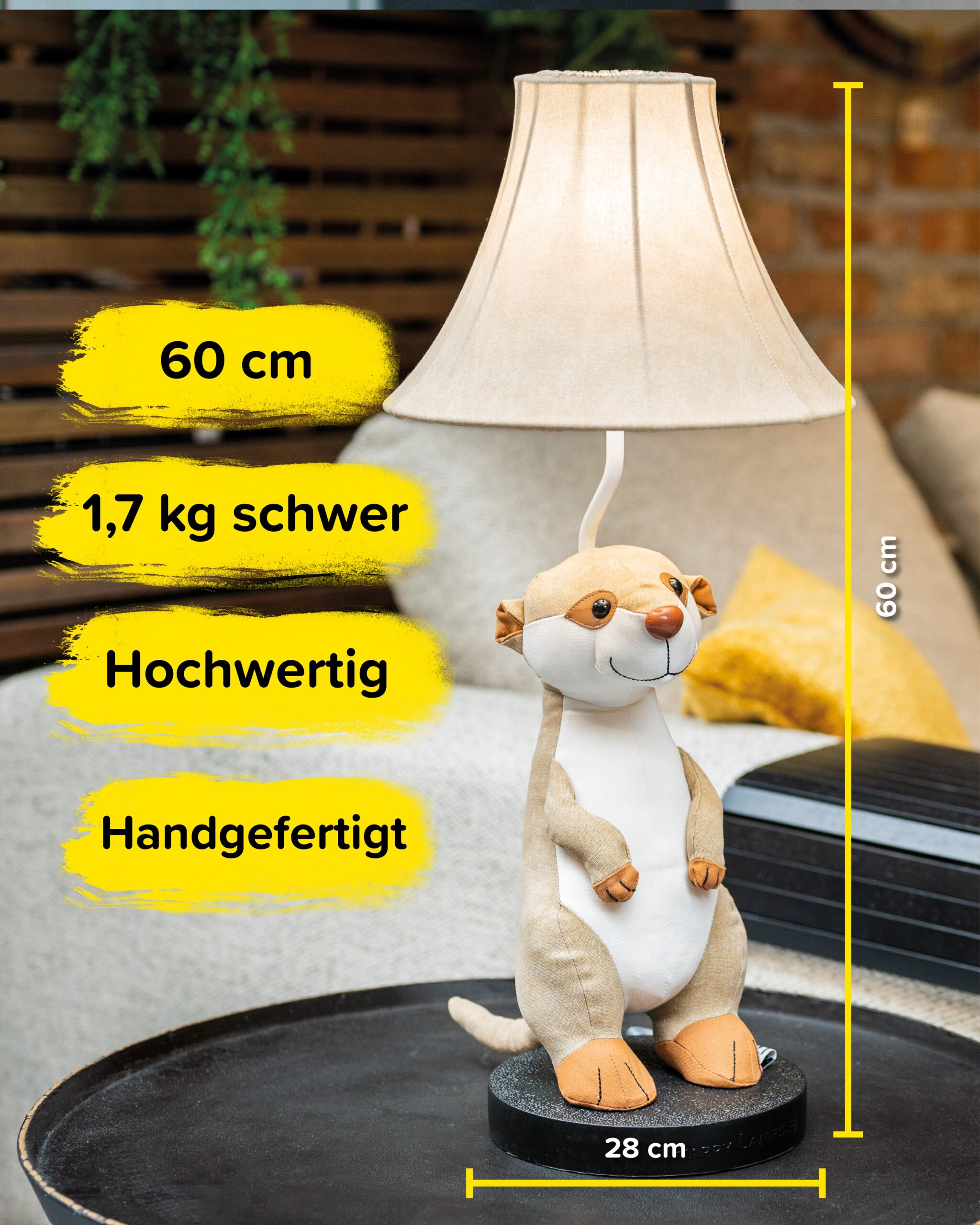 Happy Beschreibung Unser aufgeweckter lustiger Eddie ist einfach ein Garant für gute Laune. Man muss ihn nur anschauen und sein freches Grinsen macht sofort happy. Er sorgt für gute Stimmung in jedem Raum und erobert mit seinem neugierigen und wachsamen Auftreten die Herzen im Sturm. Limitiert – Das macht Eddie besonders Eddies aufgeweckter frecher Blick zieht einen direkt in seinen Bann. Sein fröhliches Gesicht mit den kleinen lustigen Knopfaugen und dem grinsenden Mund steckt einfach an. Der hochwertige robuste Stoff in Erdfarben passt perfekt zu Eddie. Seine aufrechte Körperhaltung ist typisch für ein Erdmännchen, die stets wachsam und neugierig ihre Umgebung erkunden. Der zum Körper farblich passende beige Stoff des Lampenschirms spendet ein angenehm warmes Licht, das gesellige Stunden verspricht. EinsatzgebietUnser lustiges Erdmännchen Eddie fühlt sich überall wohl. Er liebt die Gesellschaft, hat gern etwas Action und Kinder sowie Erwachsene um sich herum. Er passt wirklich in jeden Wohnraum, aber auch ins Büro oder in die Agentur. In geselliger Runde ist Eddie genau richtig aufgehoben. Als Lampe im Flur- oder Eingangsbereich macht Eddie ebenfalls eine gute Figur. Hier begrüßt er mit seinem aufgeweckten Wesen jeden neuen Gast. Sein fröhliches Grinsen ist direkt ansteckend und macht einfach gute Laune, bei Groß und Klein. Happy Lamps Unsere Happy Lamps in Stofftieroptik sind nach höchstem Standard durch das renommierte Testinstitut Hansecontrol sicherheitszertifiziert. Sie werden in Handarbeit hergestellt und bestechen durch ihr exklusives Produktdesign. Schaue dir gerne unsere weiteren einzigartigen Modelle an. In unserem Onlineshop findest du die komplette Happy Family und kannst dir deinen Liebling direkt nach Hause bestellen.
